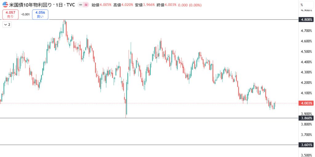 金利動向で言えば、長期金利は小動き。切り下げてはいますが、4.0%を明確に割って来ていない状況です。FF金利は10月、12月と利下げを織り込んでおり、その影響はどのように出るか。短期金利の一時的な下降になるのか、10年、30年という長期金利をしっかり抑えられるのかがポイントになりそう。ドル離れで債券売りが出ればまた金利は下げない方向にいくのでそれらは確認しておきたい。
