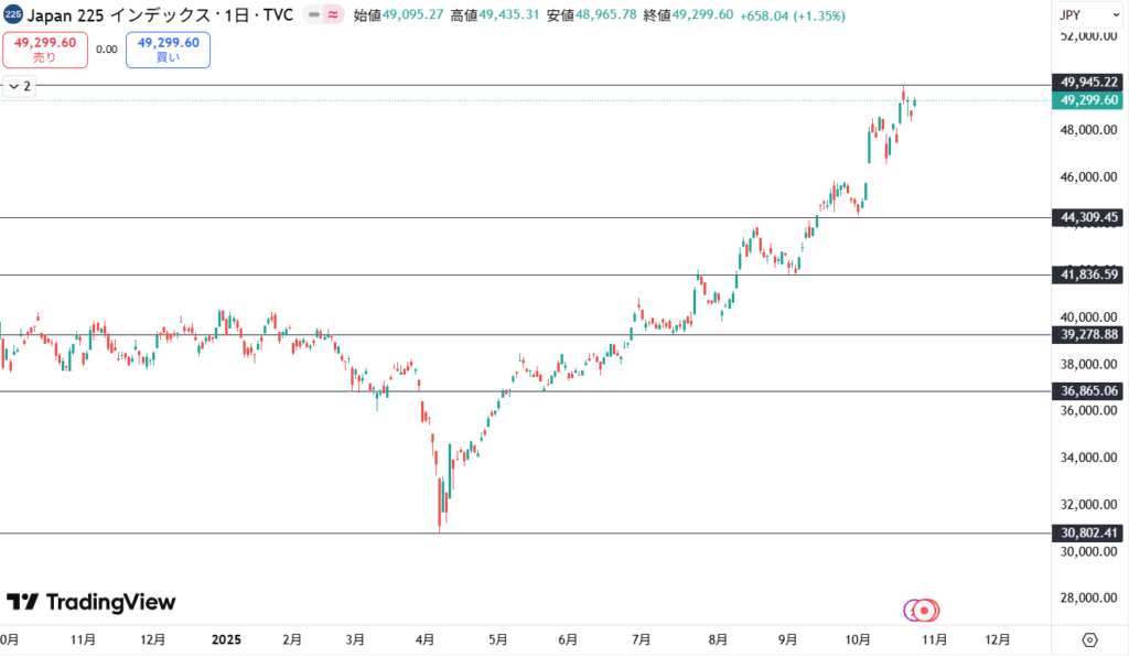 日本市場は高市相場とも言われており、かなりイケイケの展開です。高市氏が積極財政を掲げていることにより、円安は大きく進んでおり、株価にも好材料として高値を更新し続けています。(円キャリー再開?とも言われる上昇)