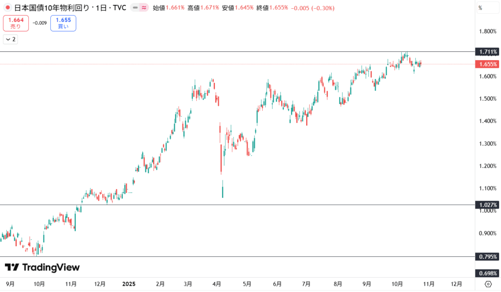 ドル円も高市氏が自民党総裁になってさらに上昇しており、円安が支えとなり大きく上昇中。153円にも届くほど円安が進んでいます。インフレ、賃金が大きな問題とされる中、行き過ぎた円安をどう止めるのか。積極財政を目指すにも、インフレが行き過ぎると大きな問題となりそう。このかなり難しい局面をどう乗り越えるかに注目が集まります。「責任ある積極財政」の進捗が気になる所です。